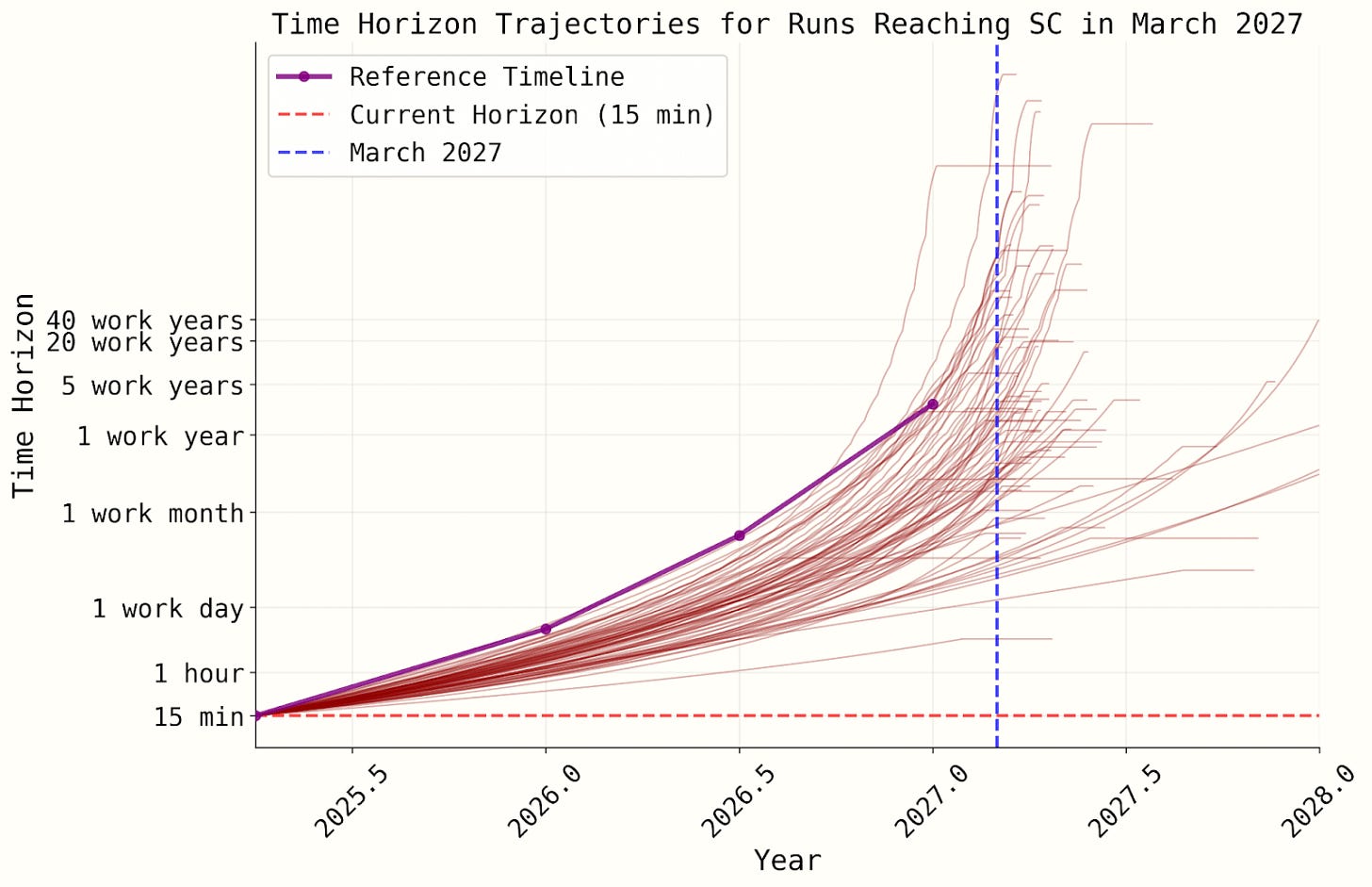 The AI 2027 authors assign ~40% probability to a “superexponential” time horizon growth curve that shoots to infinity in a few years, regardless of your starting point.